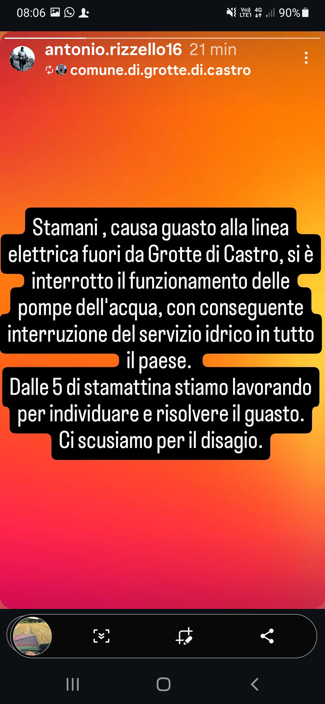 Questa mattina, a causa di un guasto alla linea elettrica fuori da Grotte di Castro, si è interrotto il funzionamento delle pompe dell'acqua, con conseguente interruzione del servizio idrico in tutto il paese. Dalle ore 5,00 di stamattina si sta lavorando per risolvere il guasto.