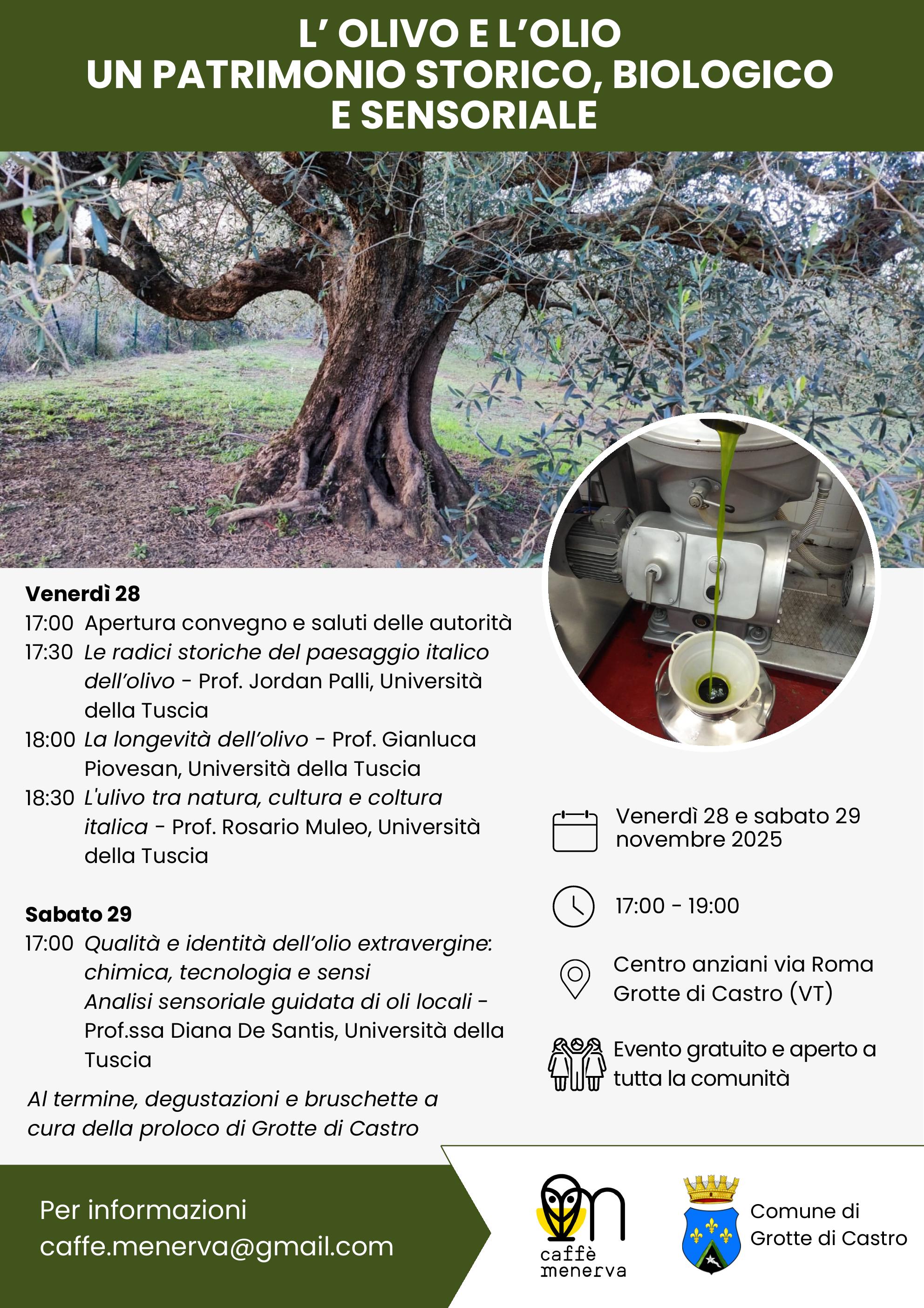 Nei giorni di venerdì 28 e sabato 29 novembre 2025 presso il Centro Anziani di Grotte di Castro sito in Via Roma, dalle ore 17,00 alle ore 19,00, avrà luogo un evento, gratuito e aperto a tutta la comunità, dedicato alla conoscenza della storia e della natura della cultura italica e del paesaggio italico dell'olivo, con analisi sensoriale guidata dell'olio e degustazione finale con bruschette a cura dell'Ass. Pro Loco di Grotte di Castro.